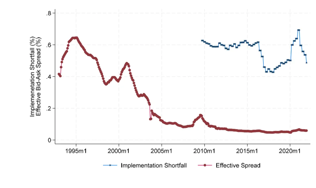 월가에서도 지수 거래에 주목하기 시작하면서, 대형 증권사들이 자본과 인력을 지수 거래에 투입하기 시작했어요. 이 덕분에 거래 비용도 낮아지고(빨간 선), 주문 실행 오차도 코로나 시기를 제외하면 감소했죠(파란 선).